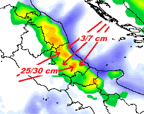 In questa mappa propongo una stima degli accumuli, non perchè debba essere presa come certezza, ma sempre come ipotesi possibile. Si parte da 2/3 cm delle quote di bassissima collina, per poi arrivare alle zone di montagna dove si potranno raggiungere i 30 cm.