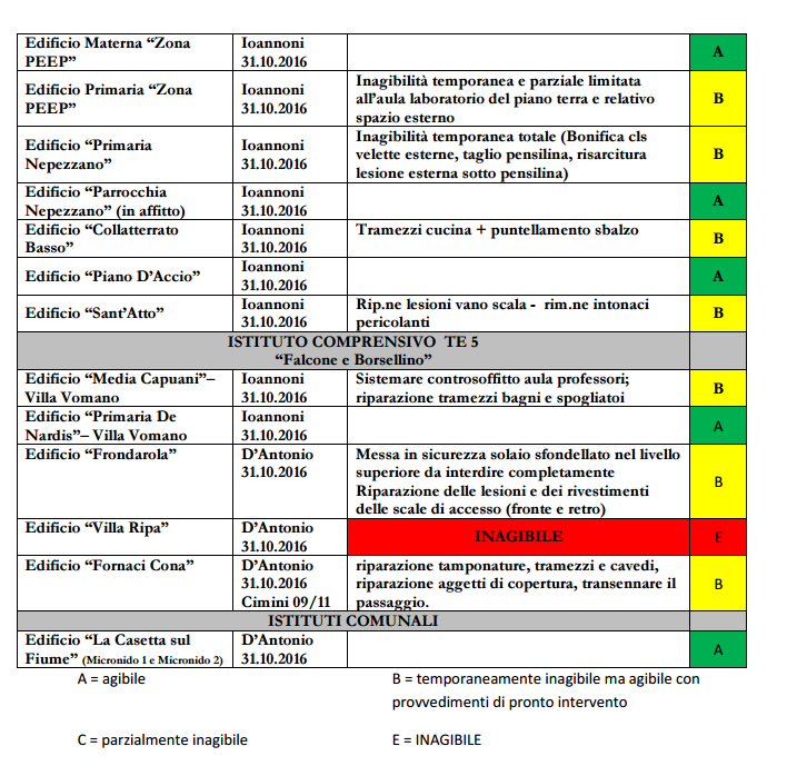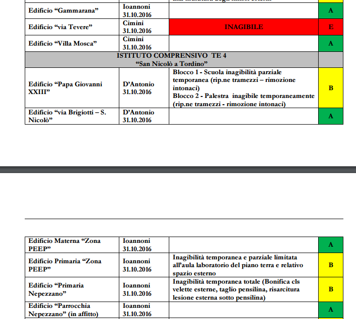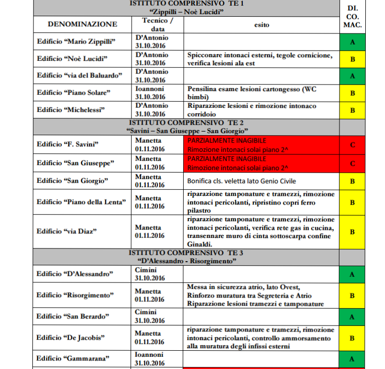 Il comune di Teramo per la trasparenza ha reso pubbliche le schede di valutazioni visive del danno da parte della Protezione Civile sugli edifici scolastici.