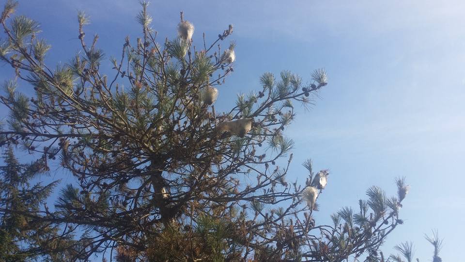 La zona è quella di Santa Chiara a salire e tutti i pini sono rivestiti da palle bianche.