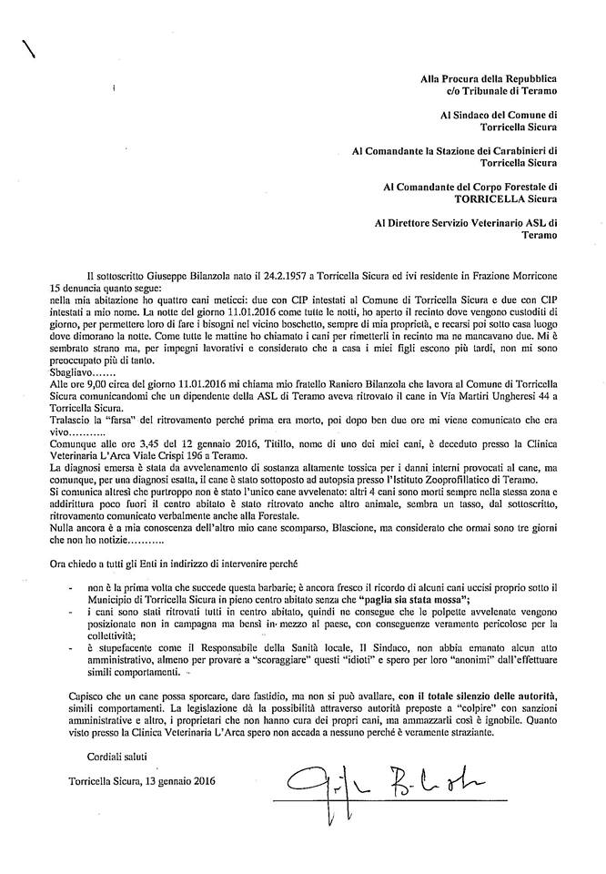 Nella dettagliata denuncia, Marco, oltre a piangere il suo fedele amico Titillo e alla disperata ricerca di un altro cagnolino, ricorda gli altri quattro zampe trovati morti nella zona di Torricella Sicura?