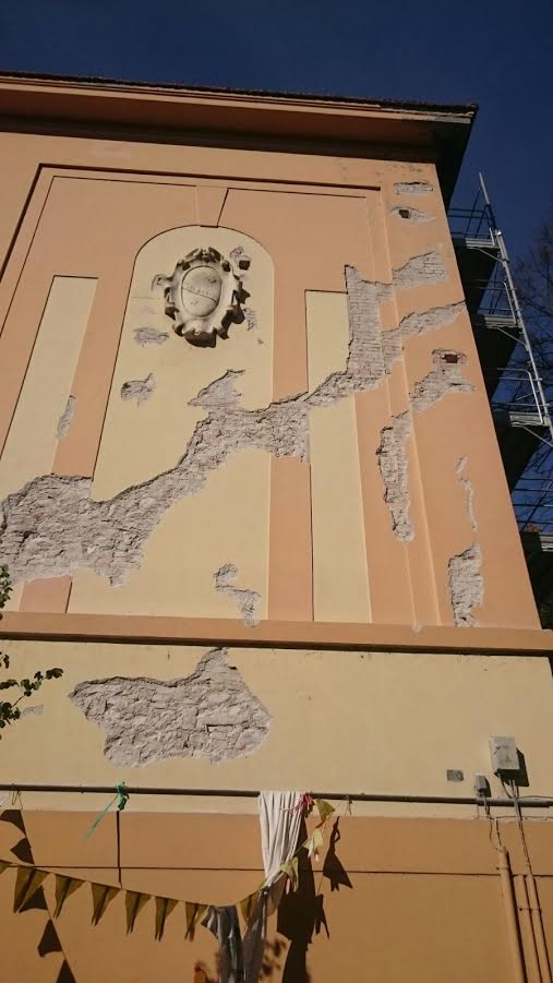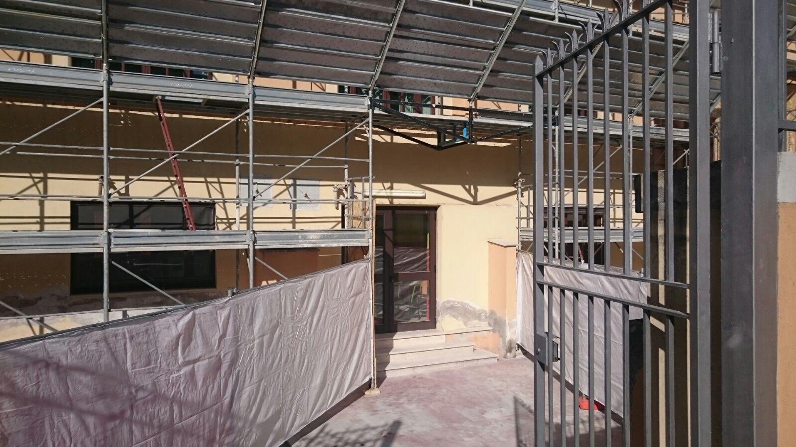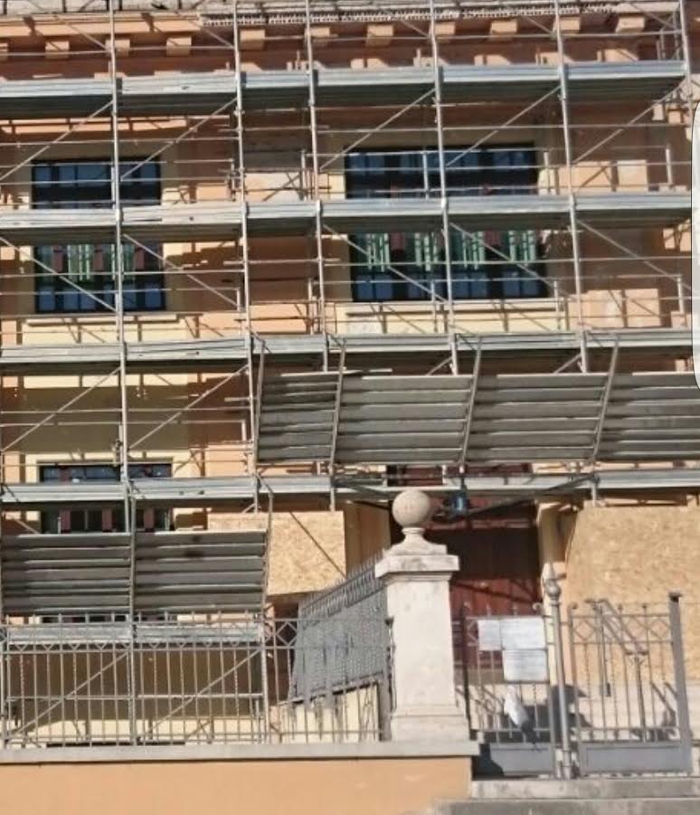 L'unica entrata e uscita è data dall'entrata principale perchè l'altra porta è chiusa dal ponteggio e lo scivolo dei disabili interrotto per la picconatura.