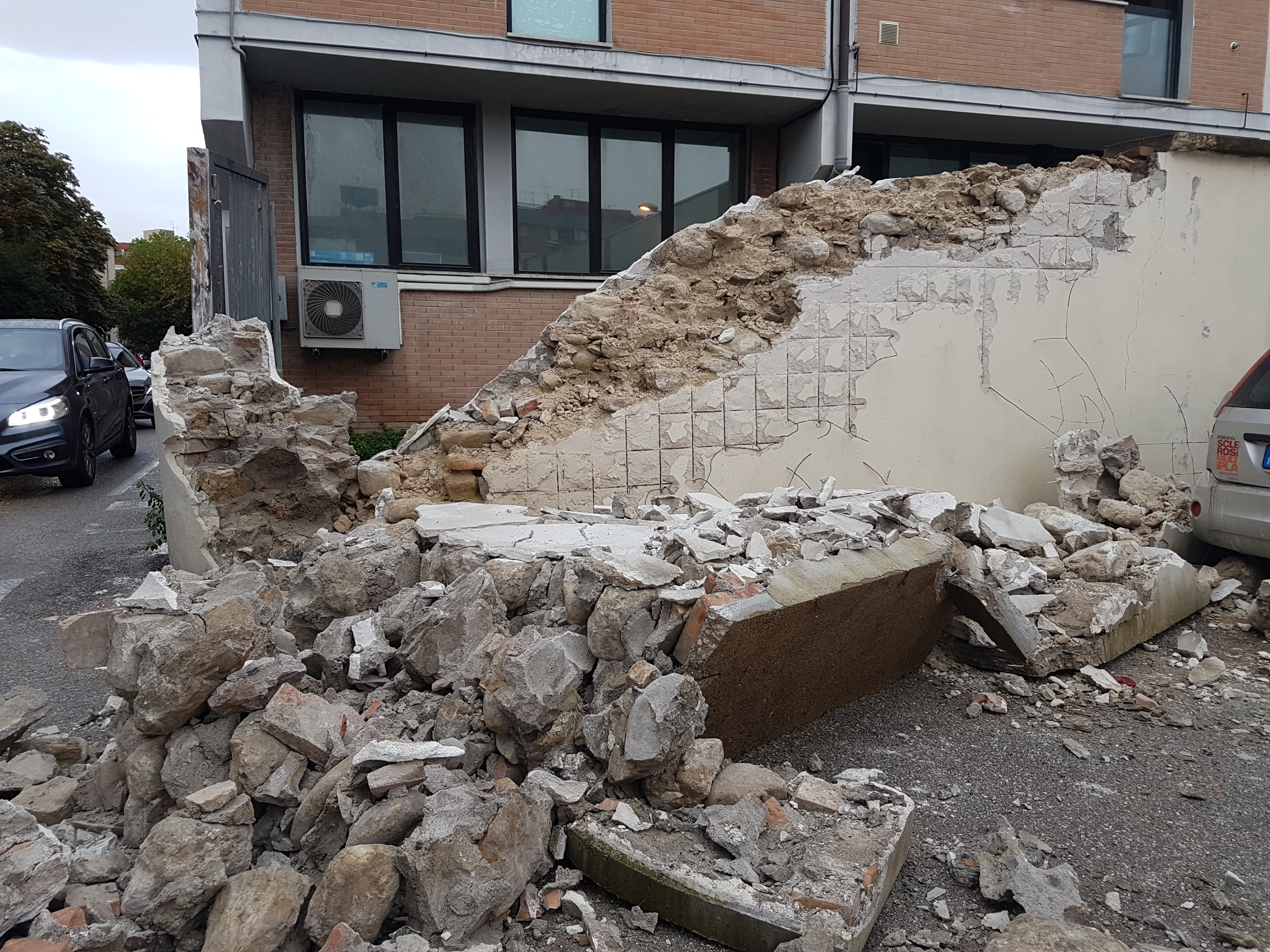 Un muro di separazione tra la scuola superiore del Comi, le varie associazioni ( Croce Rossa), le aule dello Scientifico e il supermercato Si, è crollato questa mattina a causa di una manovra di un camion. Zona parcheggio. Nessun danno alla scuola o a persone di passaggio.