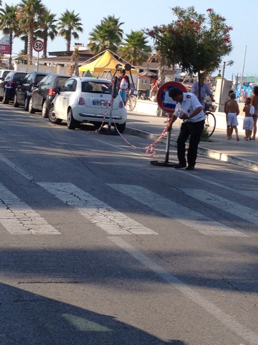 Ora di pranzo. Il pranzo di Ferragosto. Chalet e locali pieni. Ci sono i turisti, i giornalieri, la provincia di Teramo e l'Abruzzo. L'Abruzzo e l'Italia. L'Italia e il resto dell'euro e qualche moneta extracomunitaria. Il lungomare di Roseto è pieno di auto. I lettori de I Due Punti si fumano una sigaretta fuori da un locale. L'arrivo dell'autovettura della Polizia Municipale, la sistemazione di un cartello di divieto dietro le autovetture in sosta.