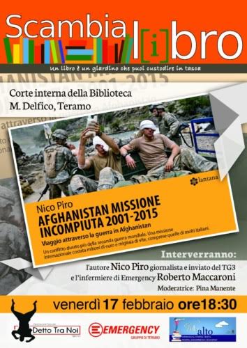 Insieme a Piro interverrà l’infermiere di Emergency, Roberto Maccaroni, il quale, da anni, presta la sua opera per militari, civili, cristiani e talebani senza distinzione alcuna. Emergency è in Afghanistan dal 1999 dove ha curato bene circa 5 milioni di persone su un totale di 30 milioni di abitanti. Modererà l’incontro la giornalista Pina Manente e in sala sarà disponibile il volume dell’autore. A seguire le proposte di lettura mensili dello Scambialibro.