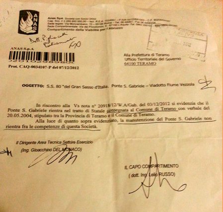 Si legge a firma del capo compartimento Anas Ing. Lelio Russo " ....si evidenzia che il Ponte San Gabriele rientra nel tratto di Statale consegnata al comune di teramo con verbale del 20.03.2004, stipulato tra la provicnai di teramo e il Comune di Teramo. Alla luce di quanto sopra evidenziato, la manutenzione del Ponte San Gabriele non rientra fra le competenze di questa società".Siamo andati dietro la notizia e abbiamo letto il Processo verbale di consegna, stipulato tra la Provincia di Teramo e il Comune di Teramo.