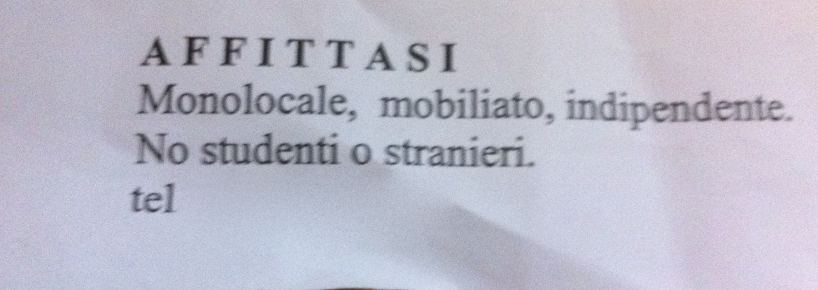 In tempi non sospetti, in tempi di persecuzione legale dell'umanità, erano gli ebrei, gli zingari, gli omosessuali, i protagonisti del manifesto della razza. Ora sono gli stranieri. Comprendo tutto. Non affitto agli studenti perchè mi rovinano l'appartamento, ma perchè non affittare agli stranieri? Se in regola con il permesso di soggiorno, se lavoratori, perchè? Per quale motivo? Perchè scriverlo? Perchè testimoniare il proprio razzismo? Un piccolo bigliettino preso in una mazzetta vicino ad una cassa di un bar. simile a molti altri. Ne abbiamo contati una decina con diverse tipologie, numeri telefonici, identità, ma con la priorità di negare l'affitto agli stranieri. L'Ignoranza umana non ha confine. I vicini siamo noi.