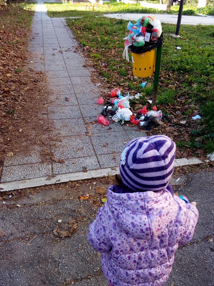 Guardano quei cestini ricolmi, quell'immondizia a terra, la sporcizia degli adulti.