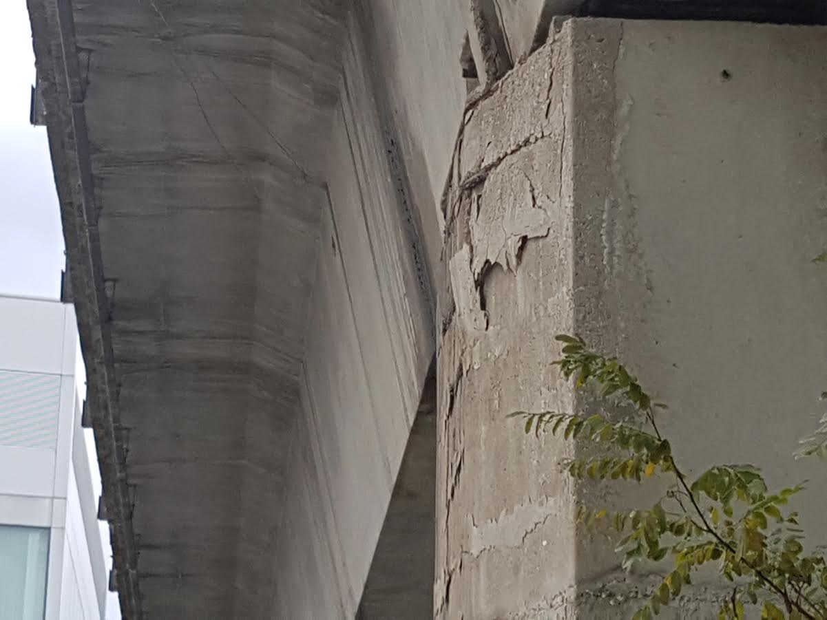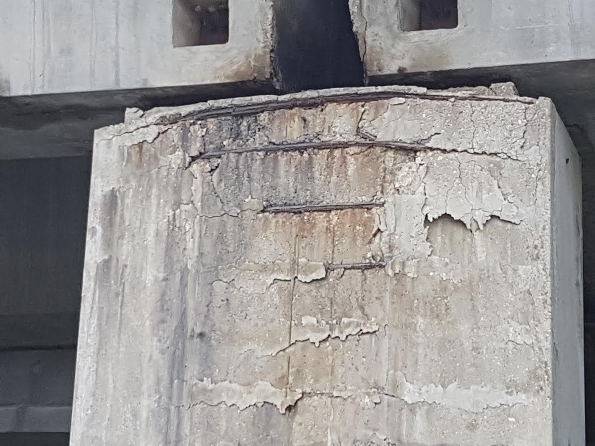 Un pilastro presenta un problematico gonfiore e ha tutti i ferri all'esterno del cemento.