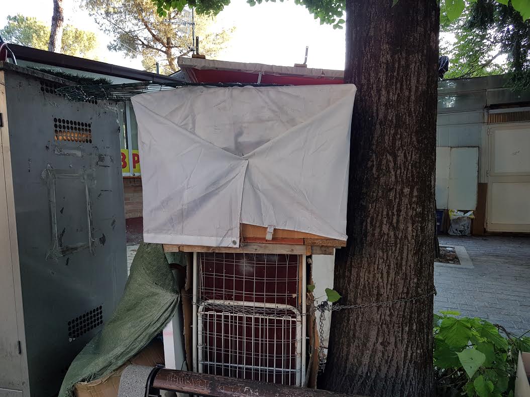 Strutture ricettive che ospitano alla vista frigoriferi legati ad alberi e piccoli cumuli di materiali di lavoro abbandonati in bella mostra.