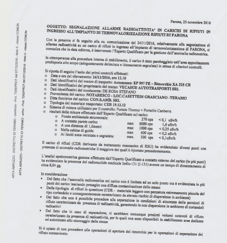 Lettera del 25/11/2016 che fa riferimento al controllo su di un carico del giorno prima ( 24/11).