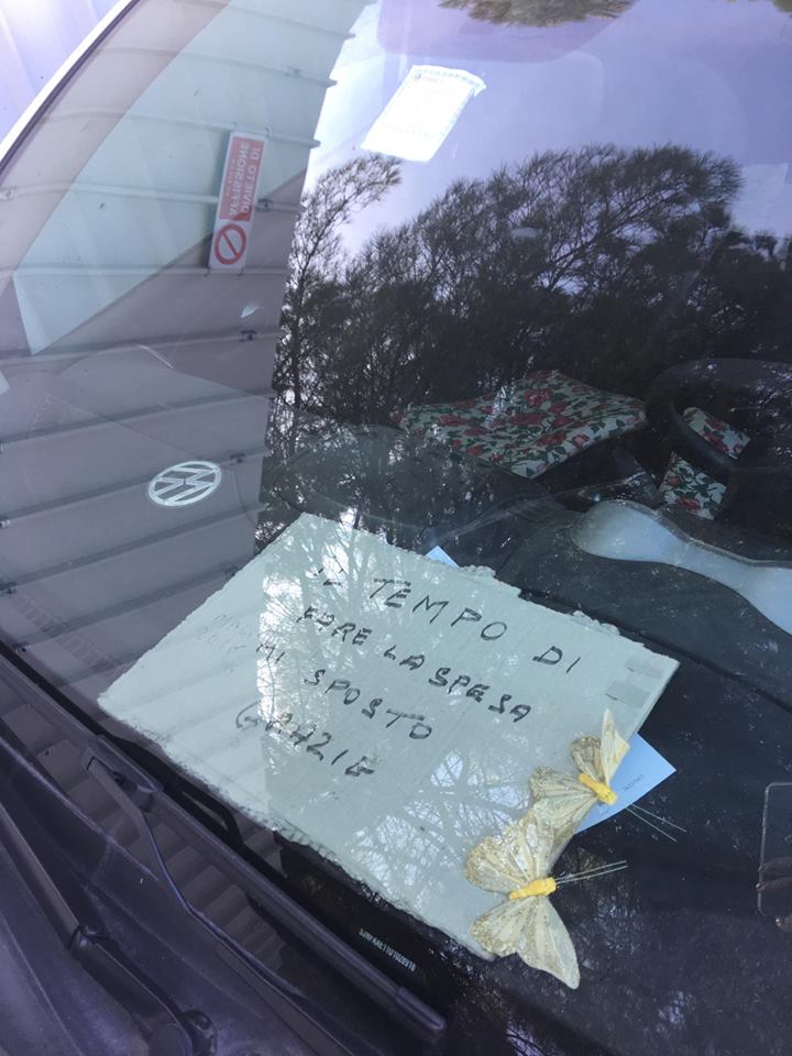 Un' auto che riporta una strana autorizzazione " Il Tempo di fare la spesa e mi sposto. Grazie"