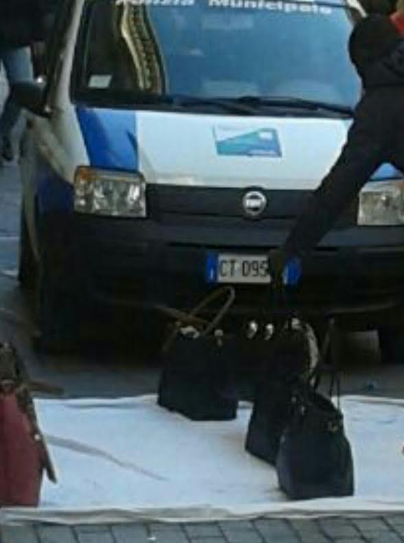 I venditori ambulanti smerciano la merce falsa in pieno centro durante il mercato del Sabato.