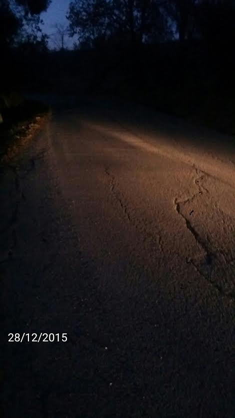 Strada funestata dalle buche e priva di strisce di separazione dei sensi di marcia e moduli di corsia.