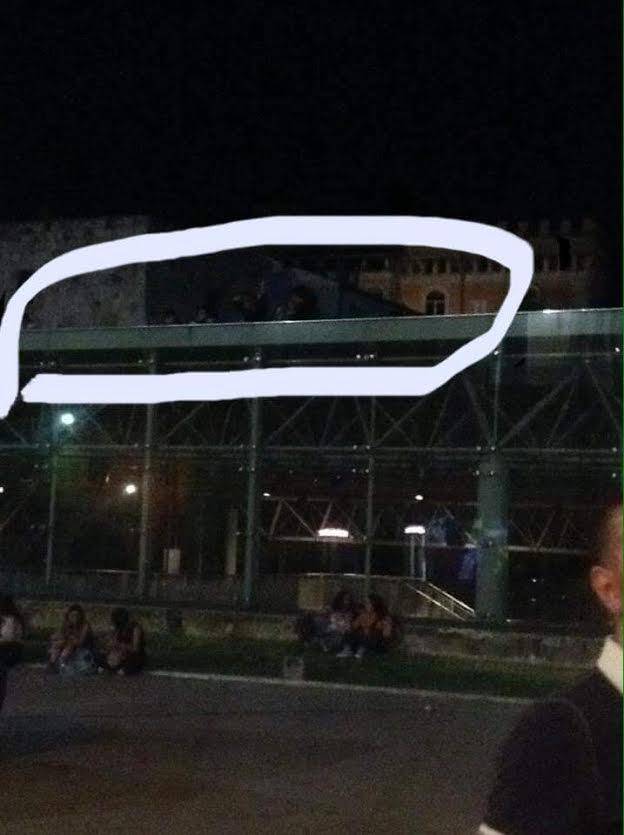Si vedono dei ragazzi che guardano la partita sulla fragile copertura degli scavi di piazza Sant'Anna.