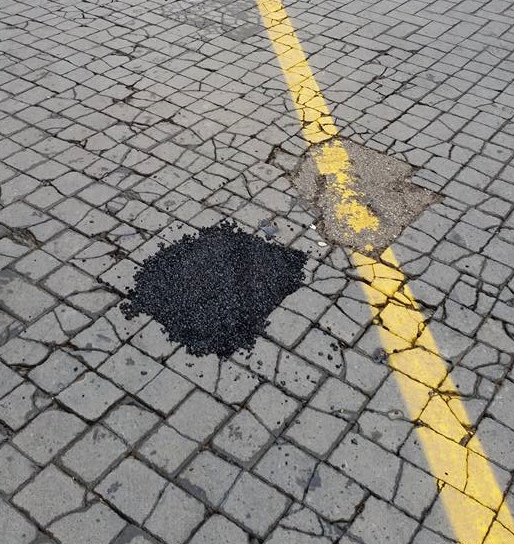 Voto massimo a Giustino Ciarrocchi, titolare dell'omonima Boutique di Corso San Giorgio, che posta sul suo profilo facebook, una foto della bellezza manufatta e un commento ironico " OGGI HO ASSISTITO AD UN NUOVO SISTEMA PER TAPPARE LE BUCHE!!.SPARGERE IL CATRAME E PASSARCI SOPRA CON LE RUOTE DELL' APETTA".