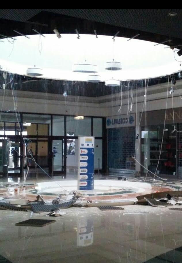Mentre i sottopassi da Roseto a Giulianova erano in fase di riempimento, mentre via Nievo a Giulianova si era trasformata in una piscina, il controsoffito del centro commerciale Val Vibrata, il lucernaio centrale, raggiungeva terra in meno di un secondo.