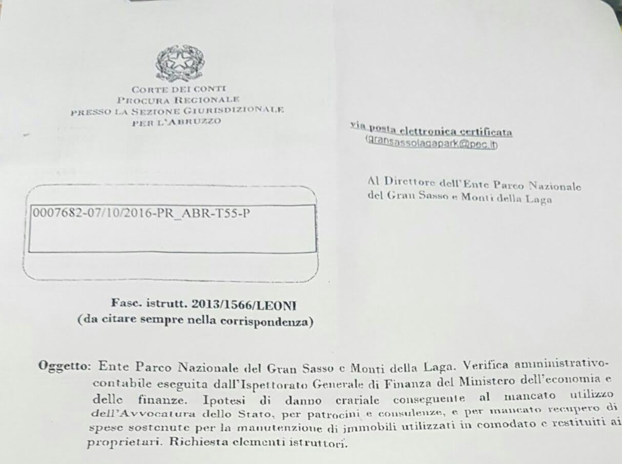 Oggetto dell' Ispezione della Corte dei Conti all'Ente Parco Nazionale del Gran Sasso e Monti della Laga.