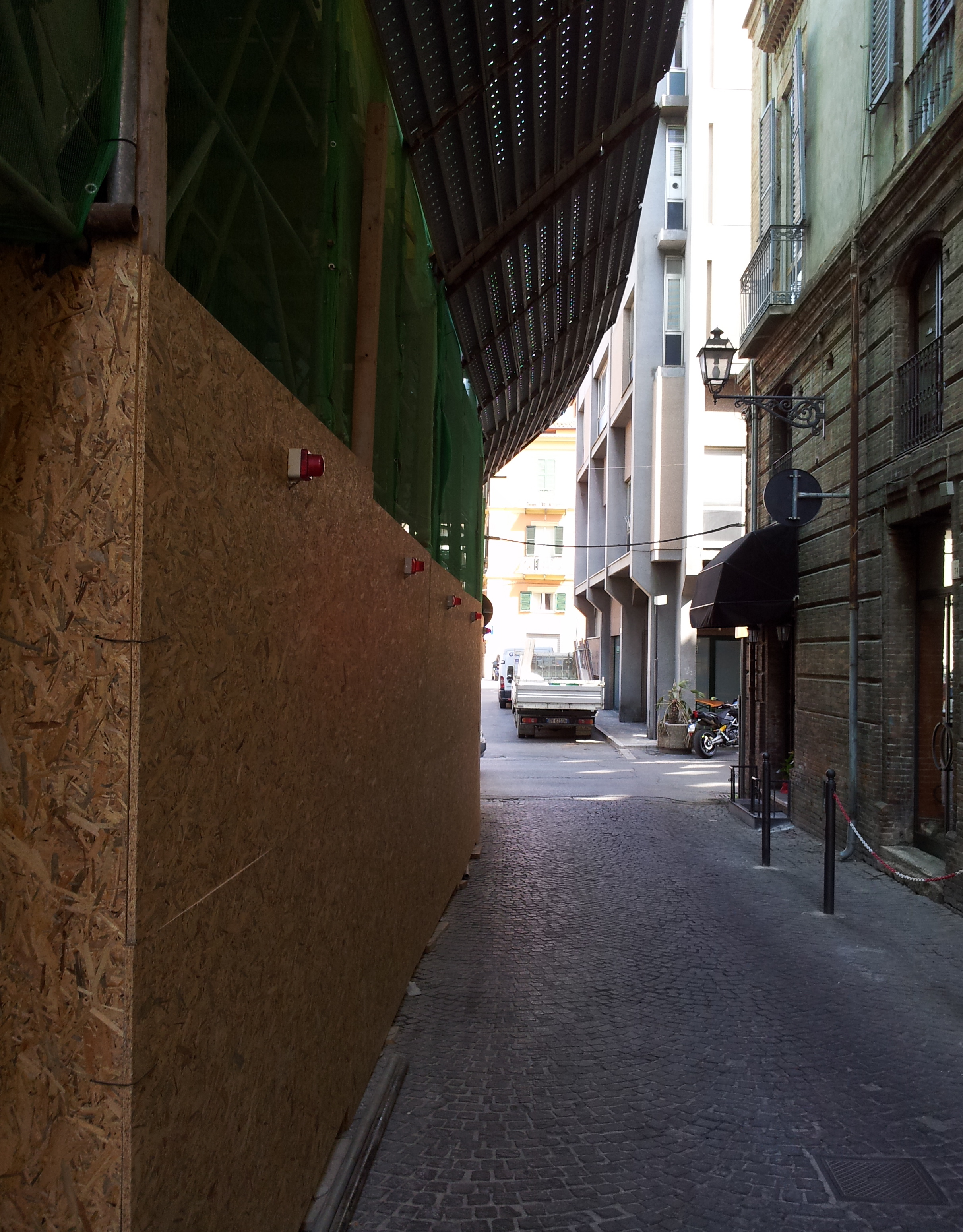 Lavorano sempre, tutto il giorno e tutta la notte. I residenti del centro storico li sentono come fantasmi vivere il cantiere come una casa. I ghostoperai. Entrano ed escono. Il cantiere di via Cesare Battisti angolo via Oberdan, è diventato un mistero. Martelli che martellano da soli, impalcature che crescono di notte, come innafiate dalla rugiada della luna.