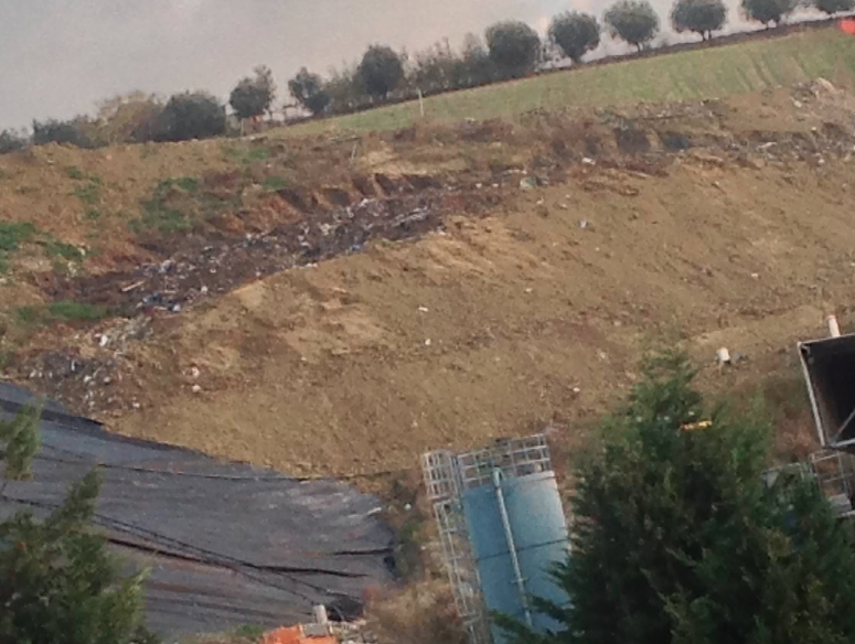 Vasca di contenimento di rifiuti della vecchia discarica colma di ogni genere di rifiuti.