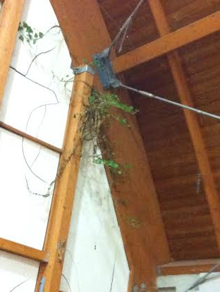 Una pianta tranquillamente albeggiava sul soffitto della palestra anticipando future infiltrazione di tutto ciò che la natura ha da poter offrire.