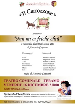 Laura Corona è una psicologa. Nella sua giornata non fa nulla. Voi pensate...dirige la cooperativa onlus "Biancaneve", per la tutela di minori. Non fa nient'altro. Dimenticavo due casa famiglia, una a Teramo e una a Sant'Egidio. I nomi delle due strutture? Cucciolo & Brontolo. A parte ciò, nient'altro. Ho dimenticato di annoverare la responsabilità della tutela dei ragazzi fino alla maggiore età. In questi anni, la D.ssa ha continuato a non fare niente, ospitando oltre 50 ragazzi minori, stranieri e con problemi con la legge. Di recente nel suo oziare, ha accolto alcuni ragazzi da Lampedusa. Arrivati in Italia con le loro storie di sofferenze e quegli interminabili viaggi con i barconi della speranza. L'ironia al servizio della bellezza di questi eroi del sociale. La cooperativa Biancaneve è una onlus e oltre ai pochi soldi pubblici ha bisogno di provvedere con altre risorse ai problemi quotidiani. Il sodalizio con la compagnia teatrale Il Carrozzone di Morro D'oro, nata come associazione culturale, accanto al sociale, alla provocazione artistica, all'attenzione per i più deboli, è un'occasione per dimostare la vicinanza di tutti i teramani alla professionalità, al cuore, all'anima, alla speranza, che il lavoro della D.Ssa Corona e dei suoi ragazzi, regala agli ospiti della casa famiglia. Il momento del cuore è al Teatro Comunale di Teramo, Venerdì 16 Dicembre alle ore 21 per informazioni e prevendita 329/4920022. Lo spettacolo si chiamerà "Nin mi ci fi friche chiù". Posto unico a 10 euro. Forza Teramani...basta poco che ce vo?