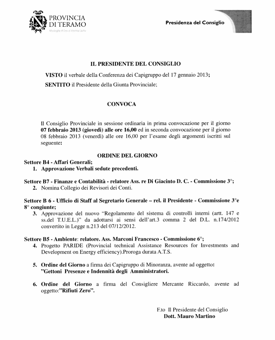 Il Consiglio Provinciale è convocato per il 7 febbraio scorso.