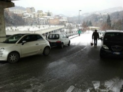 La sorpesa delle neve e del ghiaccio ha immobilizzato i parcheggi privati di Teramo. Decine di auto sono bloccate da ore nel parcheggio San Gabriele, che non ha provveduto alla pulizia della rampa di accesso. Gli automobilisti hanno provato a chiamare Carabinieri, Polizia municipale, Vigili del Fuoco e Comune ma dopo 1 ora di attesa ancora nessuno è venuto a controllare la situazione. Le risposte dei centralini? I Vigili del Fuoco hanno detto che non era loro competenza. I Carabinieri di fare normale denuncia. Il Comune si è scusato, ma si trattava di un'emergenza. Roberta ci racconta che dalle dieci, che provava a valicare la rampa, ma la pendenza ghiacciata la rendeva impraticabile. Il parcheggio di San Gabriele costeggia il lungo fiume, che notoriamente è umido e a queste temperature con la neve e il ghiaccio, il gioco stradale diventa impossibile. Gli automobilisti hanno contattato anche la direzione del parcheggio di San Gabriele, che non si è dimostrata molto affettuosa al telefono. Segnalo infatti la frase tipo " Che cosa vuole dire che non si siamo attivati"?. Visto la mancanza preventiva di sale e visto che molti cittadini spalavano, visto i risultati, la risposta è "Non abbastanza". Che succede nella nostra città? L'Impreparazione diventa un project financing, tra pubblico e privato?