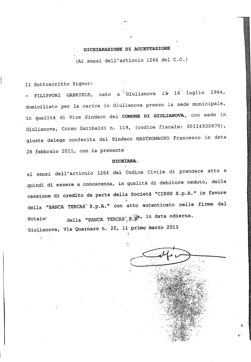 A certificarne l’esistenza è la firma apposta da Filipponi, su delega del Sindaco, su un atto con data 1 marzo 2011 con cui si prende atto della cessione a TERCAS di questo credito che il CIRSU vanta nei confronti dell’Amministrazione giuliese.