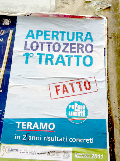 Gli operai della Teramo Ambiente ci raccontano di un primo cittadino vestito di scuro, una calzamaglia aderente come Macchia nera, un desiderio di verità, un bisogno fisiologico. Per fortuna non è servito l'intervento del dott. Robimarga. Ancora no, ci confida il Maurizio uomo. Solo di un pennarello. Una metafora della lampada di Diogene. Erano le nove di sera. Le 21. Il sindaco si è guardato intorno, più volte. Non c'era nessuno. Nessuno. Poi come un writer di Romanelli, ha tolto il cappuccio della penna, da dovizioso diacono e sconfessandosi, ha riscritto la verità. "Teramo in 25 anni risultati concreti". Un gesto clamoroso, che smentisce il mondo dei "Fatti" del Pdl. Chi sarà stato a convincere il sindaco a questa casta marciaindietro? Paolo Gatti. L'assessore regionale sarebbe andato in sogno al primo cittadino dopo una cena a base di mazzarelli e chiodi di garofano. Giorgio D'Ignazio ha denunciato il tutto agli assistenti sociali. Ma il sindaco è un uomo forte. Convinto. Colpirà ancora. Altri cartelloni sono da correggere. Quello sulle scuole, sul sociale, sulla sanità. Grazie Sindaco. Lei è il nostro eroe.