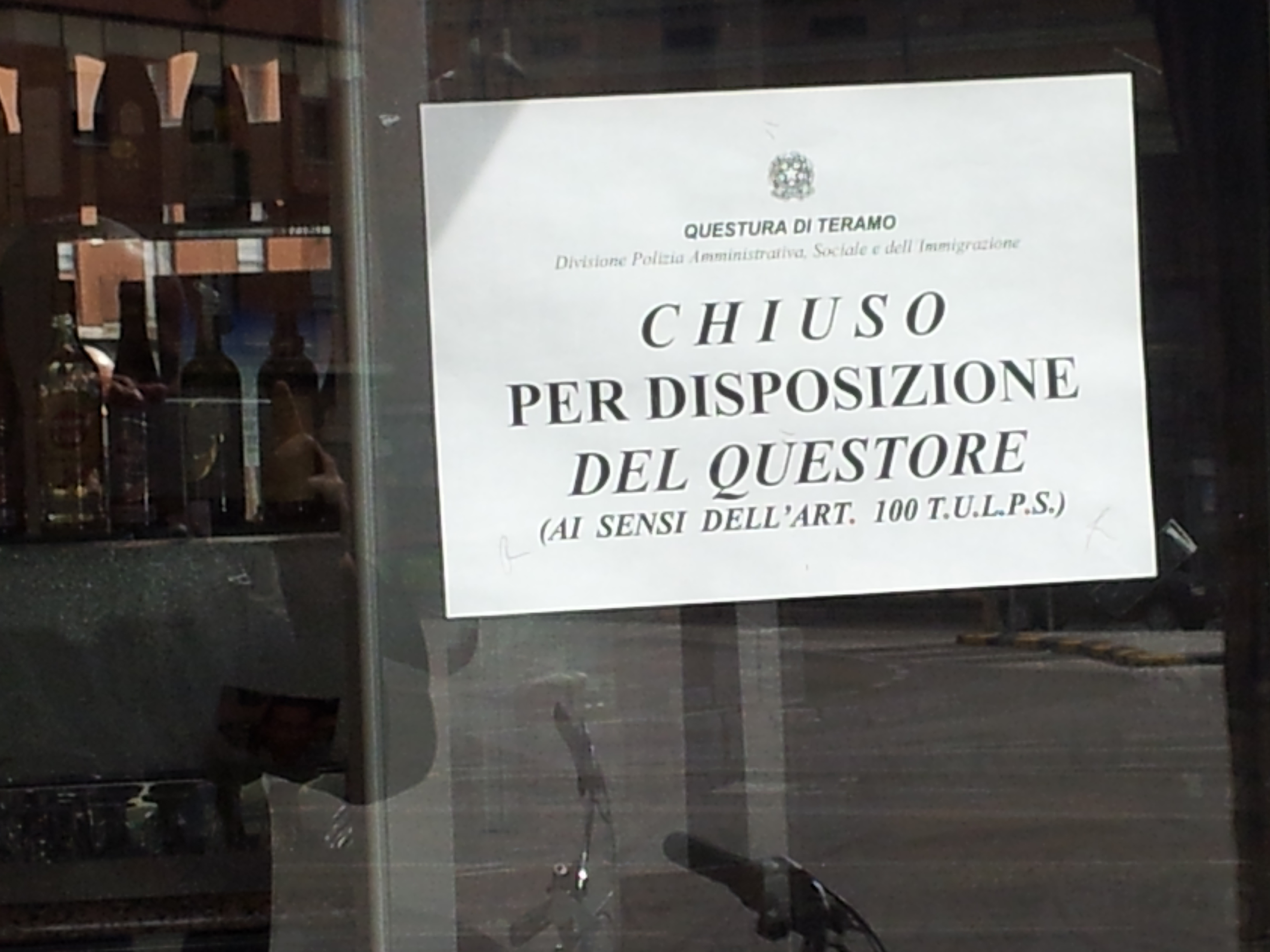 Da recenti notizie di stampa s’apprende della chiusura forzata, per 15 giorni, di due bar della Città di Teramo: “Baratto” di Sant’Atto e “Clarizia” del quartiere Gammarana.