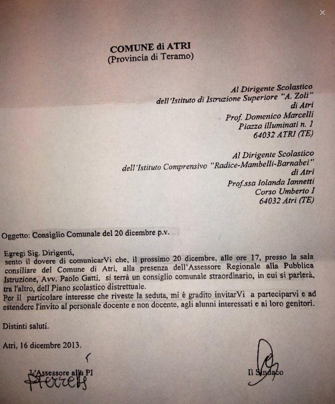 Lettera del sindaco di Atri, Astolfi e dell'Assessore alla Pubblica Istruzione, che invitavano i dirigenti scolastici Marcelli e Iannetti, a estendere l'invito a tutti, Bambini e duchi compresi.