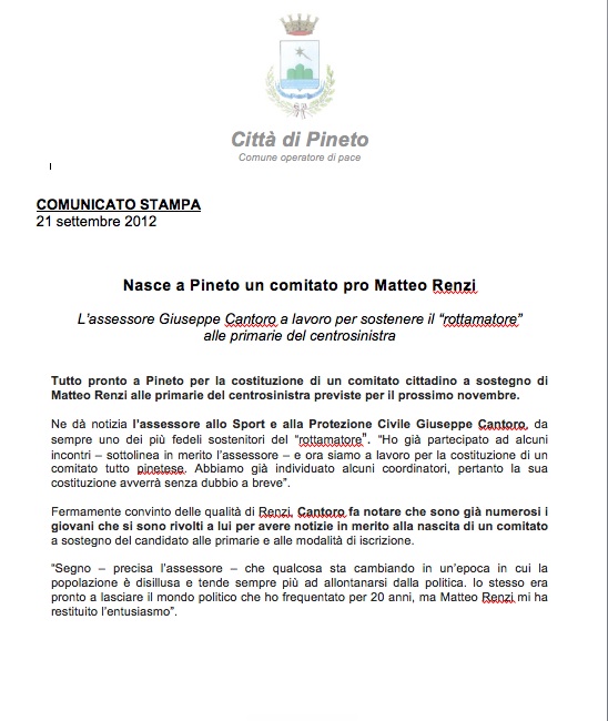 Quando ieri sera ci è arrivata la comunicazione con carta intesta del Comune di Pineto, dell'annuncio dopo giorni di gestazione della nascita di un comitato pro-Renzi, ci siamo commossi. Si legge nelle prime righe" Tutto pronto a Pineto per la costituzione di un comitato cittadino a sostegno di Matteo Renzi alle primarie del centrosinistra previste per il prossimo novembre.