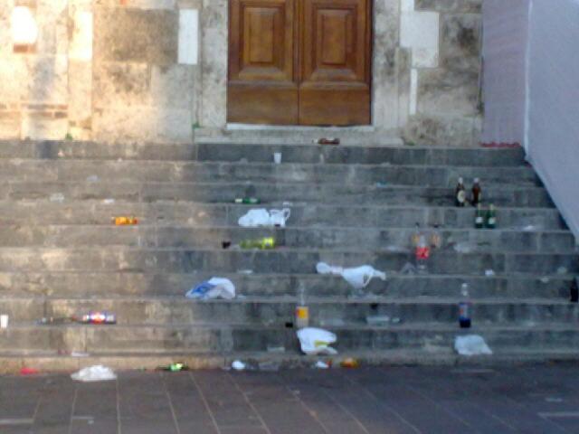 Un inviato speciale, il vescovo di Teramo Monsignor Seccia, che nella Domenica destinata al Signore cattolico, immortala i resti dei baccanali di alcuni signori mortali. Maleducati. Incivili. Scostumati. Un nostro lettore impressiona la scalinata della Cattedrale, mentre Sua Eccellenza, deluso e amareggiato, assiste impietrito al continuo violare di un luogo sacro. Piazza Martiri è la perenne sede di feste e festicciole, senza nessun tipo di controllo sull' educazione e lo stile degli invitati. Ci dimentichiamo i recenti danni al monumento più importante della nostra città? Una cartolina di degrado che non rappresenta la cultura teramana ma che diventa una pericolosa abitudine.