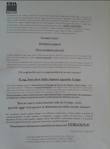 "Mentre Caripe è in sofferenza patrimoniale e Tercas chiude il periodo di commissariamento in grave perdita si continuano a pagare cospicui ad personam a numerosi dipendenti Tercas , senza peraltro neppure fornire alle OO.SS l'informativa richiesta e si spendono decine di migliaia di euro per acquistare l'auto nuova a qualche dirigente?".