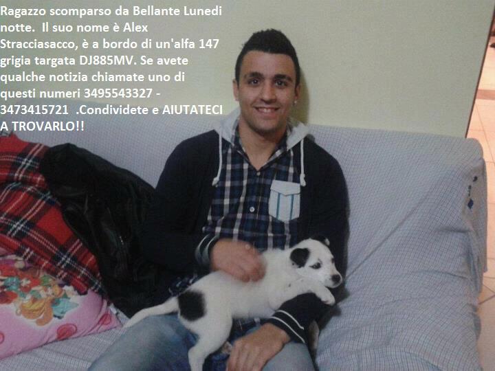 L'ultima volta che è stato visto Alex Stracciasacco è stato Lunedì sera. Era a bordo di una Alfa 147 grigia. Per favore aiutateci a ritrovarlo. I famigliari e un'intera comunità sono in pensiero. Vi è stata una regolare denuncia. Interessata anche la trasmissione della rai Chi l'ha visto?