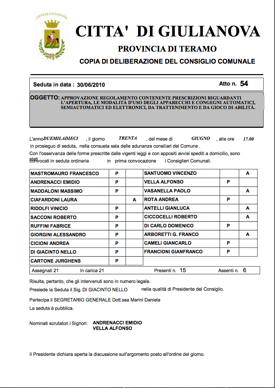 In verità nel 2010 il Consiglio Comunale ha approvato un regolamento “contenente  prescrizioni riguardanti l’apertura, le modalità d’uso degli apparecchi e congegni automatici, semiautomatici ed elettronici, da trattenimento e da gioco di abilità” ma è sufficiente leggerne l’abbrivio per comprenderne i limiti (atto n. 54 del 30/6/2010).