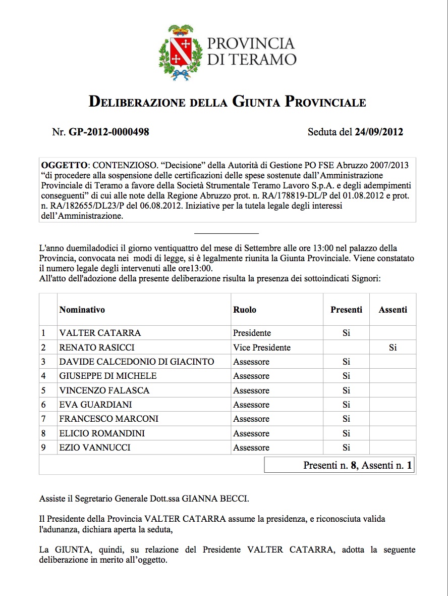 E' veramente incredibile che la Provincia di Teramo, di questi tempi, faccia fare una causa ad un legale esterno, avendo essa l'avvocatura interna con ben 4 dipendenti con profilo di avvocato oltre al dirigente avvocato. Sono basito. Forse ritiene l'Avvocatura interna non all'altezza del compito da sbrogliare. Ma non è un'offesa per gli avvocati che vi lavorano, oltre allo spreco di denaro pubblico?