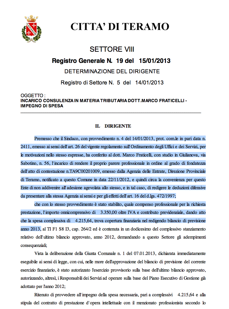 Iniziamo subito dalla determina del dirigente del quinto settore del 14/01/2013. Oggetto: Incarico di consulenza in materia tributaria al Dott. Marco Fraticelli.