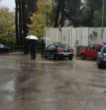 Si intravede il palazzo di Giustizia e l'auto blu del presidente della Provincia di Teramo, Valter Catarra.