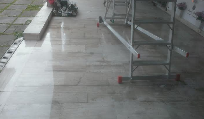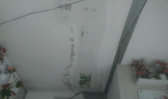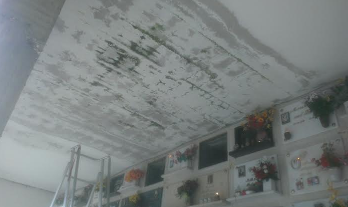 ti invio le foto della volta della cappella n.28 del cimitero di Teramo. La foto per terra e' il risultato dell'acqua che goccia dal soffitto. Nonostante i solleciti effettuati nel tempo presso l'ufficio cimiteriale, questi sono i risultati. Ho visto anche persone evitare di passarci sotto".