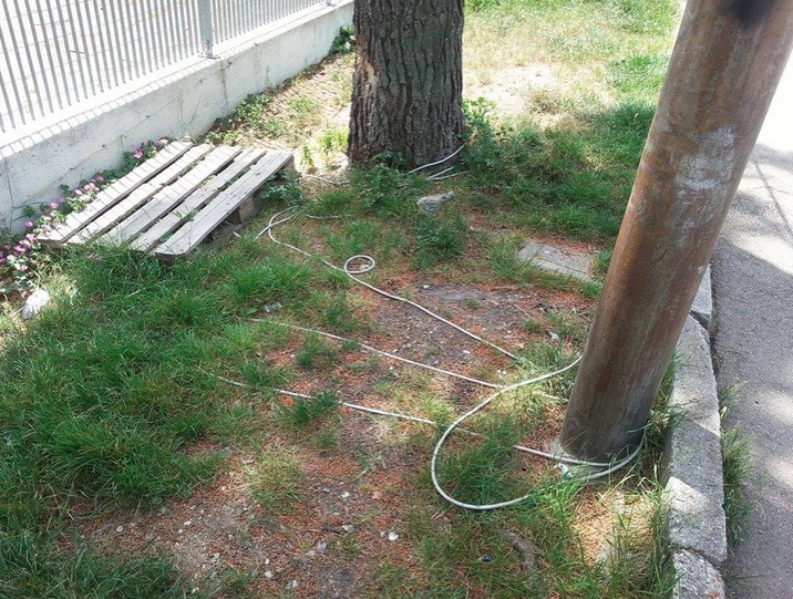 Fili elettrici a terra, barriere di ferro ovunque, sporcizia, erba alta, altissima ( stesso problema nei parchi giochi di Fonte Baiano, Piano della Lenta, San Nicolò, insomma, di tutta Teramo).
