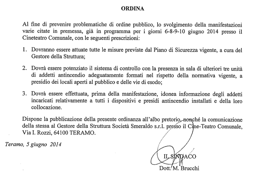 Il neo eletto sindaco Brucchi, ricalca le orme del vecchio sindaco Brucchi e firma la terza ordinanza di apertura del Teatro comunale.