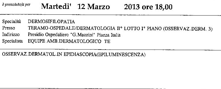 Quando ho visto l'impegnativa della disponibilità aziendale del cup di Teramo del 4/5/2012, rimandare il cittadino a martedì 12 Marzo, scusate, alle 18, per una visita dermatologica, ho pensato a uno scherzo. Poi mi sono ricordato di essere nella Asl di Teramo, che offre ai propri utenti, il meglio del territorio. Poi mi sono ricordato, di essere uno dei fortunati abitanti della regione Abruzzo, che sta vivendo un'epocale riforma sanitaria, che il nostro debito è rientrato, che siamo tutti più belli e intelligenti. Numeri senza valore e onore. Il prossimo taglio sanitario riguarderanno le porte e le finestre. "Il cielo stellato sopra di noi, la legge morale dentro di noi".