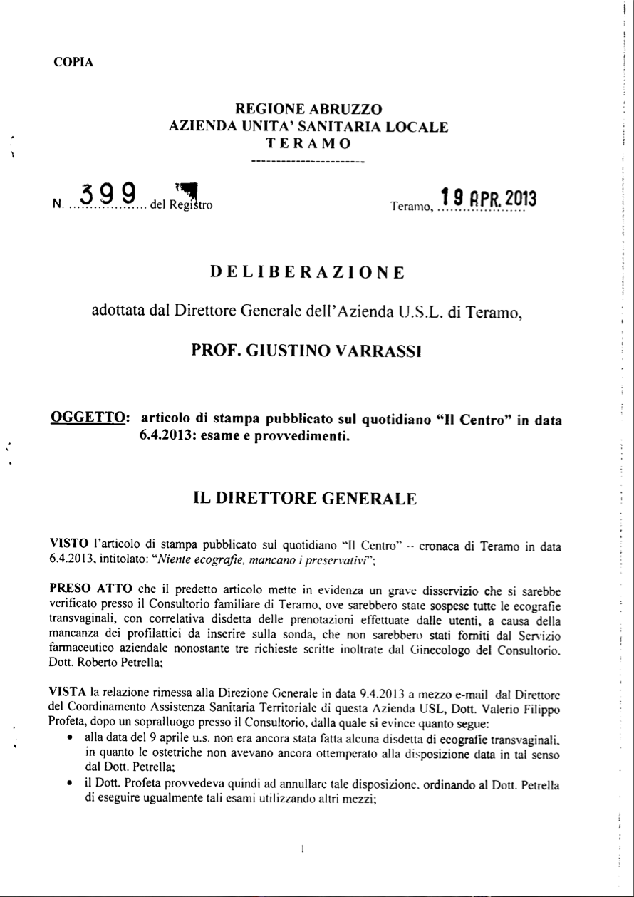 Leggendo la delibera numero 399 del 19 aprile, a firma del manager Varrassi, si legge, che l'Asl di Teramo ha dato mandato a un legale di Teramo di fornire supporto tecnico giuridico, al fine di valutare le azioni più opportune da intraprendersi a tutela dell'azienda sanitaria, in ogni sede, a seguito della pubblicazione dell'articolo di stampa pubblicato sul quotidiano Il Centro, intitolato " Niente ecografie, mancano i preservativi".