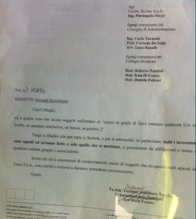 Invito chi sia a conoscenza di comportamenti, anche di soggetti che ricoprono ruoli apicali in Te.Am S.p:A., non corretti e consoni, a darmene immediata comunicazione".