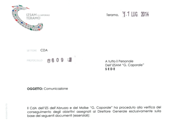 Malgrado i tentativi di delegittimazione, e degli attacchi personali contenuti nelle controdeduzioni diretti, in alcuni casi specificamente nei confronti di componenti del Cda, lo stesso resta fermo nei propri compiti affidati dalle leggi che hanno come orizzonte unicamente l'indirizzo, il coordinamento e il controllo delle attività dell'Izs e nel caso di specie la valutazione imparziale, trasparente e garantista della realizzazione degli obbiettivi assegnati al Direttore Generale".