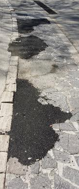 Pezze di asfalto, bitume a macchia di leopardo o gattopardo.