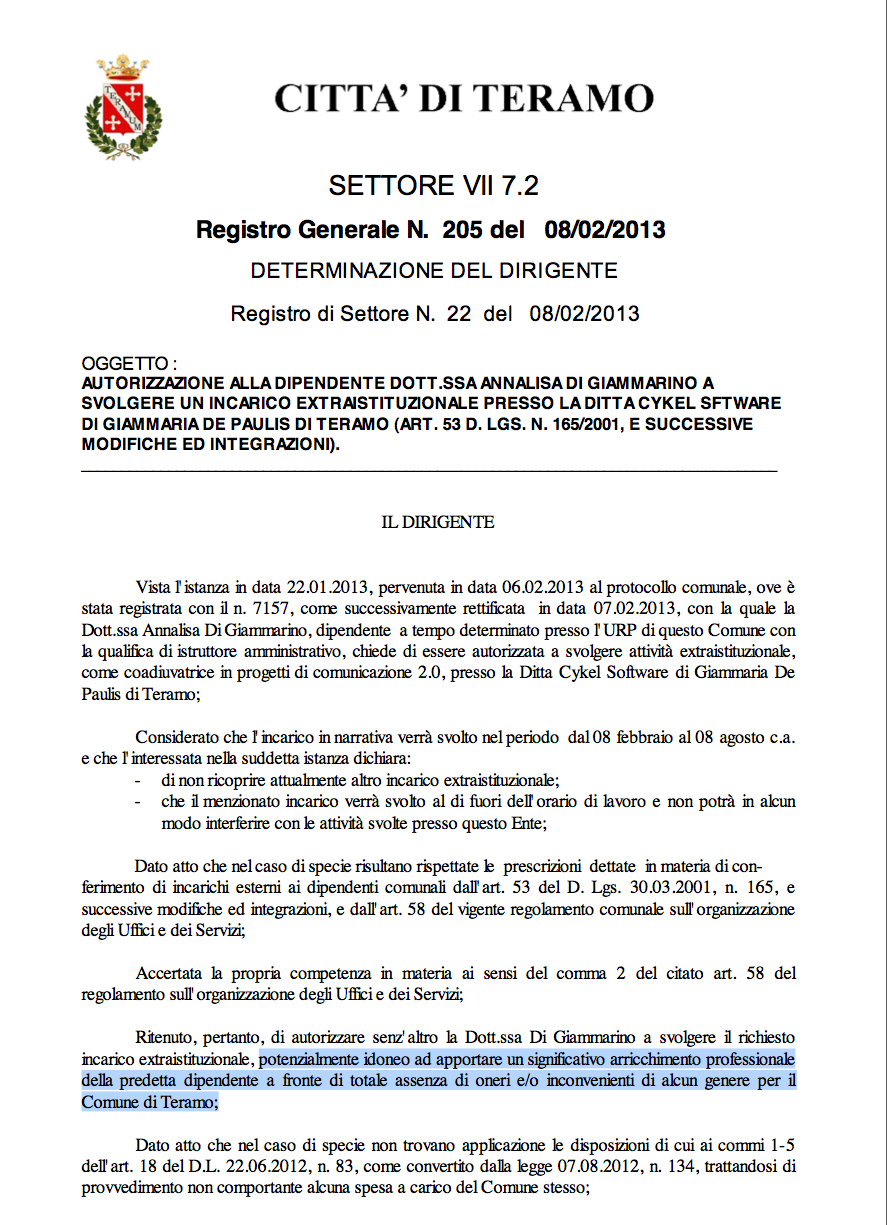 Si legge " di autorizzare, per le ragioni di cui in premessa, la Dott.ssa xxxxxxxxxx, dipendente a tempo determinato presso l'URP di questo Comune con la qualifica di istruttore amministrativo, a svolgere attività extraistituzionale in qualità di coadiuvatrice in progetti di comunicazione 2.0 presso la Ditta Cykel Software di Giammaria De Paulis di Teramo dal 08 febbraio al 08 agosto 2013;