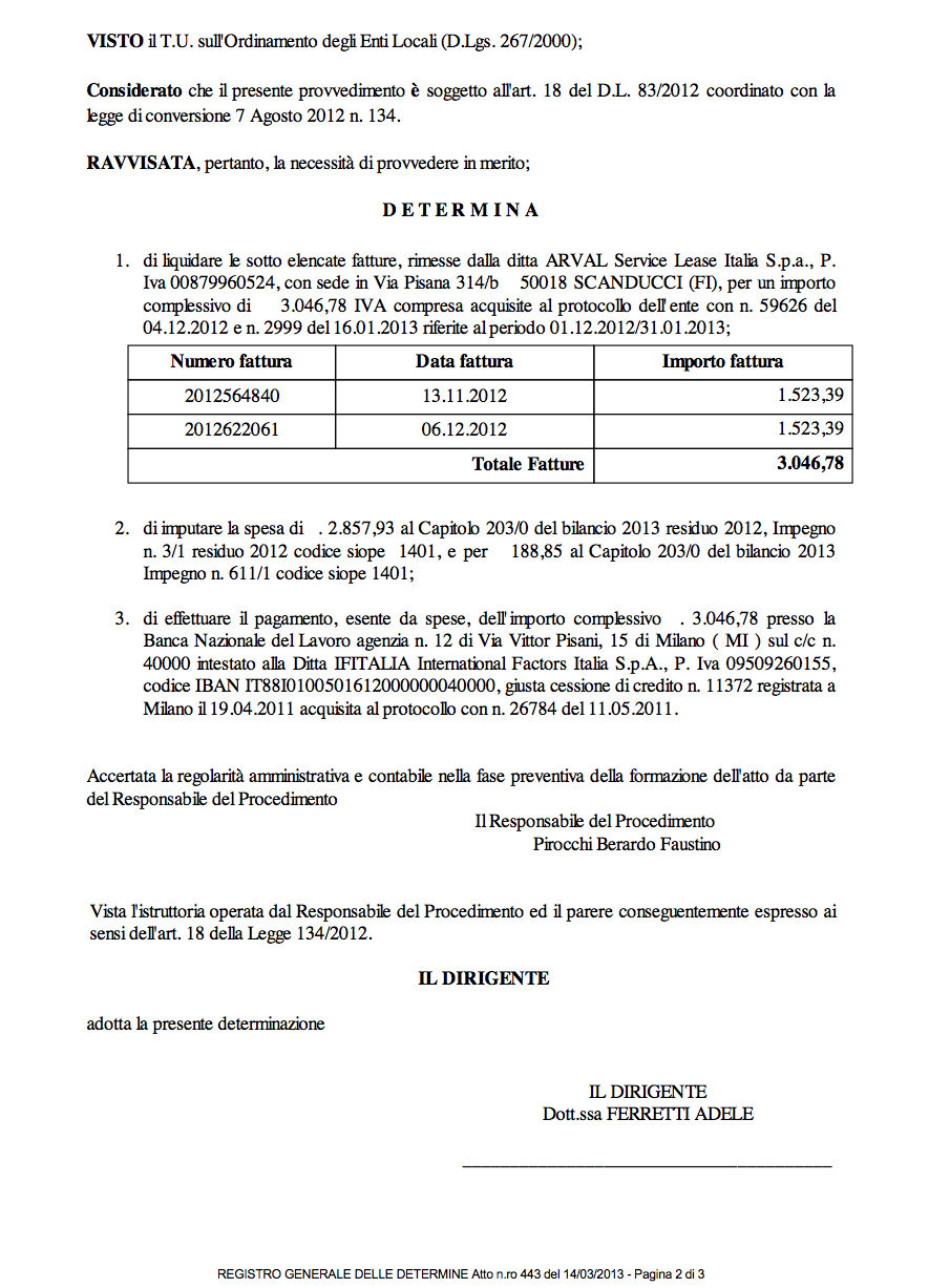 "Con determina dirigenziale n. 274 del 12.02.2010, è stato approvato il servizio di autonoleggio a lungo termine di un' autovettura AUDI A6 TDI QUATTRO TIPTR, senza conducente , per la durata di 4 anni e percorrenza di 80.000,00 Km, da destinare all' Ufficio di Gabinetto del Sindaco; Che con lo stesso atto e stato affidato la fornitura della locazione a lungo termine dell' autovettura sopra descritta alla ditta xxxxxx verso un canone mensile di €. 1.259,00 + IVA per un totale di €. 1.523,39 /mese da pagare con rate anticipate".