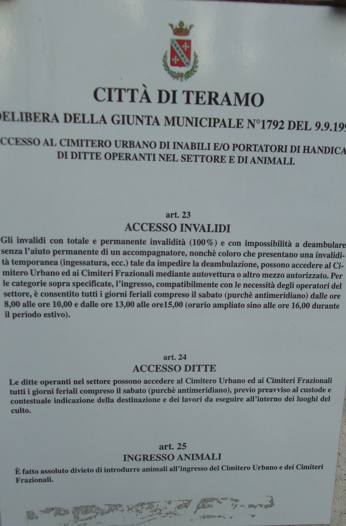 Si legge all'ingresso senza il senso della livella " Gli invalidi con totale e permanente invalidità e con l'impossibilità di deambulare senza l'aiuto di un accompagnatore, possono accedere al Cimitero Urbano, compatibilmente con le necessità degli operatori del settore, è consentito tutti i giorni feriali dalle ore 8 alle ore 10, dalle 13 alle 15".